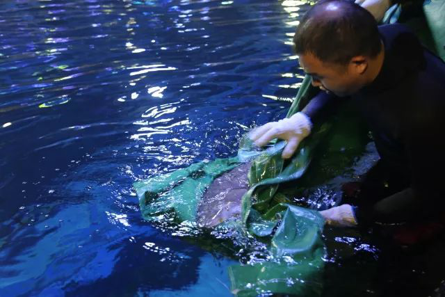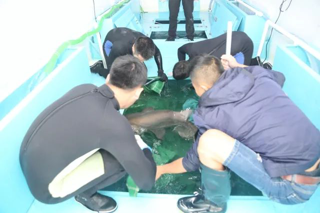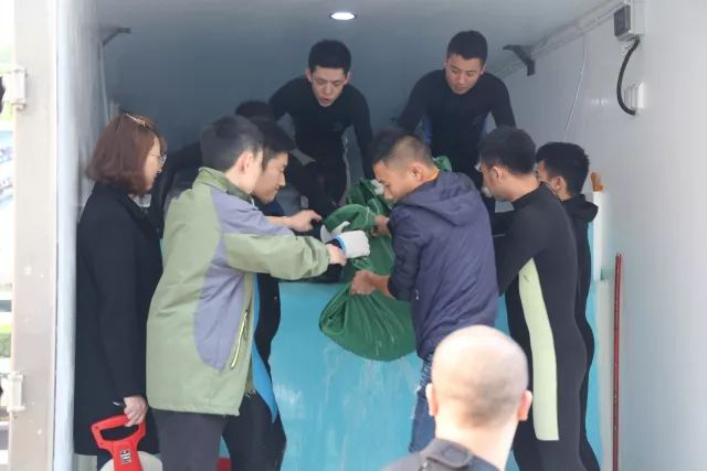 大家都显得小心翼翼,生怕惊扰了这几位“客人”。慢慢地将其搬运到了他们新家-大海槽。